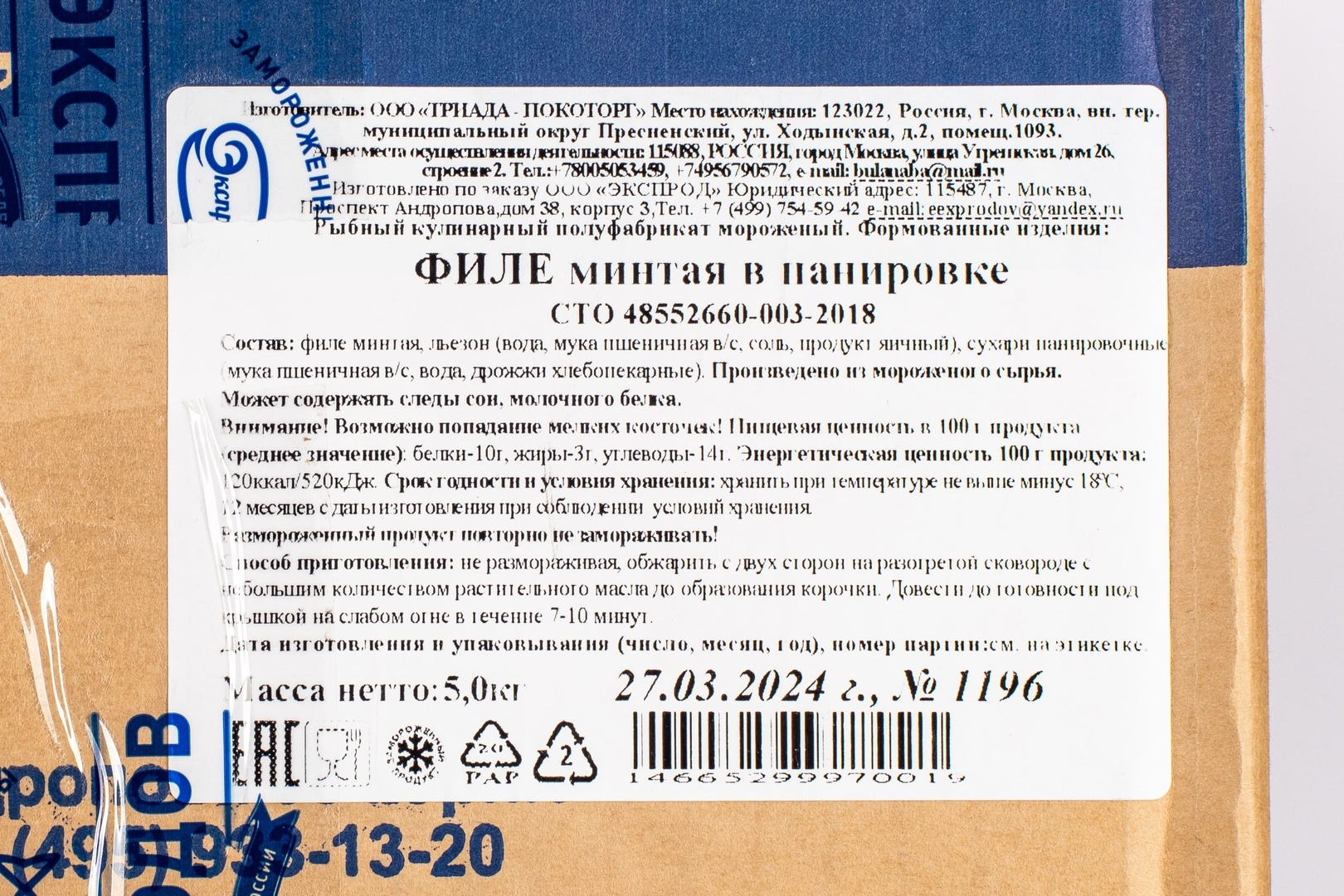 07.11.2024За качество филе ставлю "5", но за качество сборки продукции “0". Сегодня привезли две коробки (10 кг) филе, в одной из них не хватает почти 800 грамм. Общая масса вместе с коробкой 4,586 кг , из них 120 грамм сухарей.
