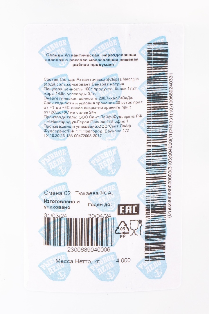 Сельдь Атлантическая Рыбное Дело Слабосоленая 300+ 4кг