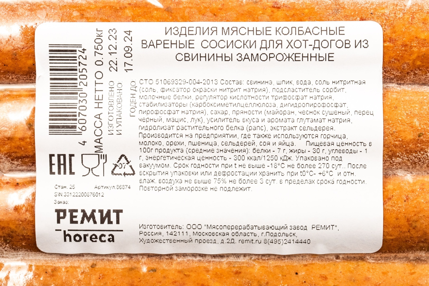 Сосиски из Свинины Ремит для Хот-Догов Замороженные 75г в/у