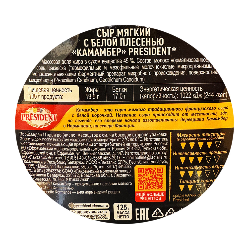 Сыр камамбер President с белой плесенью — это мягкий сыр с неповторимым сливочным вкусом и нежной текстурой. Он идеально подойдёт для сырной тарелки, а также станет прекрасным дополнением к фруктам. Отлично плавится, поэтому может использоваться для приготовления горячих блюд, например, пиццы или пасты.