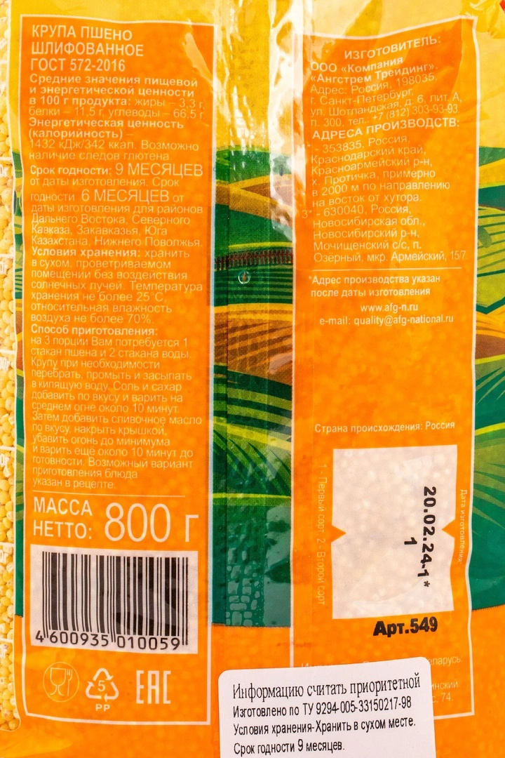 Идеальная крупа для приготовления традиционных и новых блюд! Сварите на завтрак полезную и питательную кашу или добавьте пшено в суп — получится вкусное и сытное блюдо. Шлифованное пшено Агрокультура — отличный выбор для кулинарных экспериментов. Удобная упаковка 800г позволит надолго забыть о покупке крупы.