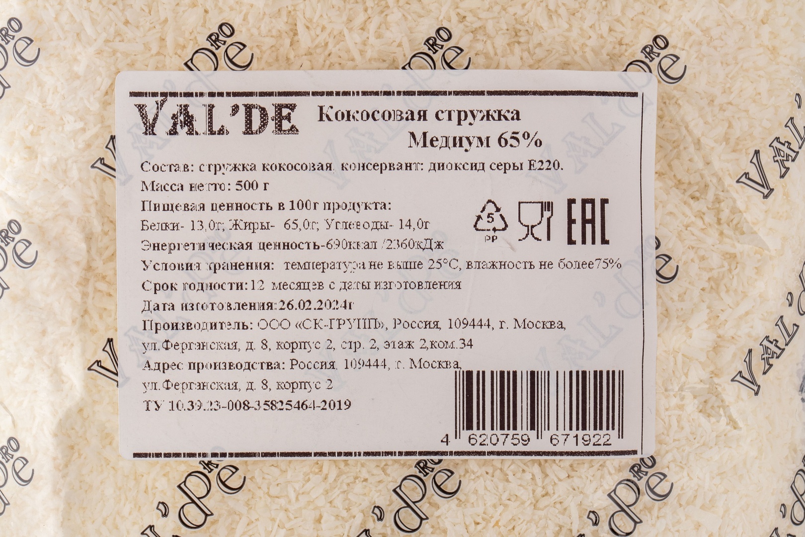 Кокосовая Стружка Valde 65% 500г