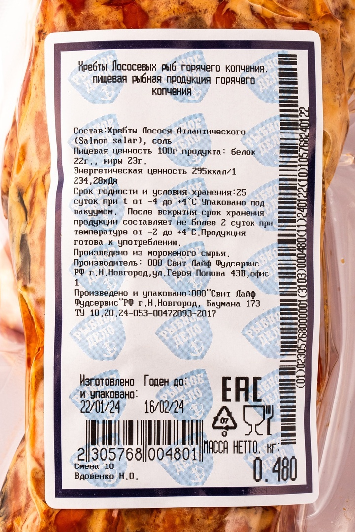 Хребты красной рыбы горячего копчения — это наилучшая закуска под пенный напиток, которая порадует любого гурмана. Продукт коптится на ольховой щепе, без использования жидкого дыма.