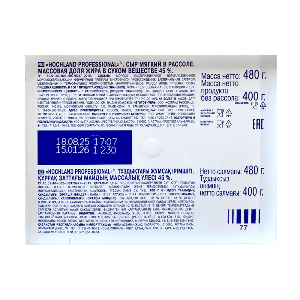 Сыр мягкий в рассоле Hochland Professional имеет нежный, сливочный вкус и универсальную консистенцию, которую легко нарезать красивыми кубиками, разломить или даже намазать – поэтому его удобно использовать для приготовления закусок, салатов, в качестве самостоятельного блюда с добавлением трав, или в составе сырной тарелки. Не содержит растительных жиров. Массовая доля жира в сухом веществе 45%. Вес продукта: 400г. (вес продукта с учетом рассола 480г).