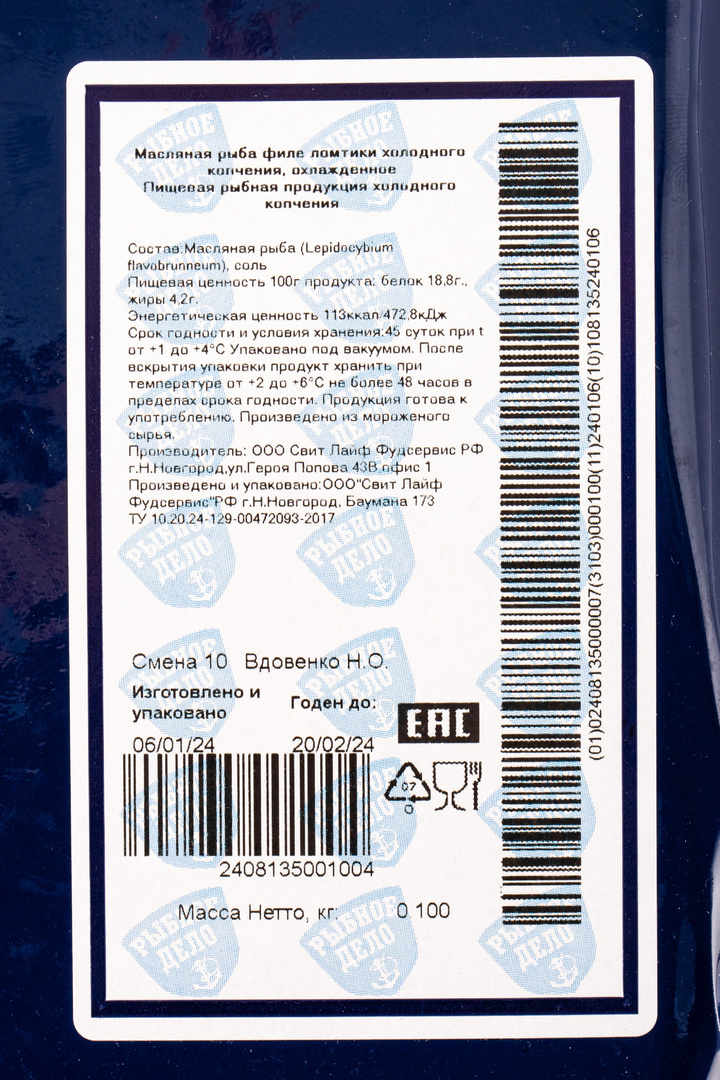 Масляная холодного копчения считается высококачественным продуктом. Обитает эта рыба только в чистой воде. Поэтому не содержит в себе вредные вещества. Зато богата полезными для здоровья человека витаминами и микроэлементами. В этой рыбе в большом количестве содержатся витамины группы В, РР, A и D. Масляную рекомендуют для повышения иммунитета, укрепления нервной системы, понижения уровня холестерина.