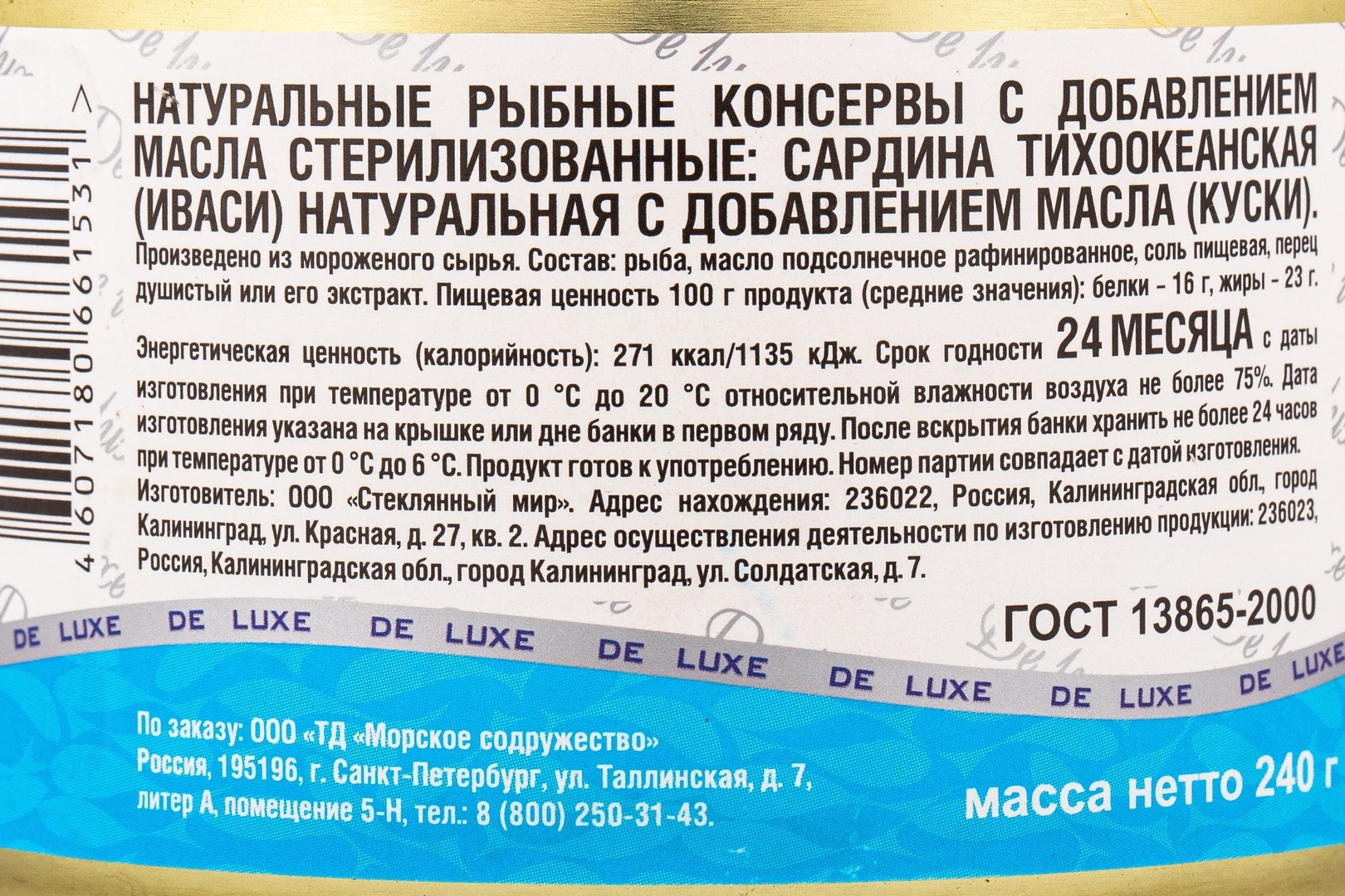 Сардина тихоокеанская, масло подсолнечное рафинированное, соль поваренная пищевая, перец душистый или его экстракт