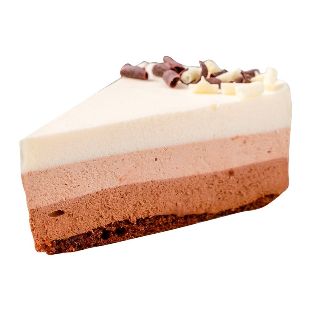 Знаменитый торт «Три шоколада», нежный, легкий и воздушный трехцветный мусс, который готовят из темного, молочного и белого шоколада.