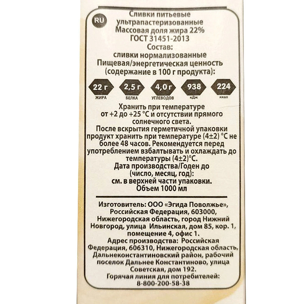 Сливки Эlakto Ультрапастеризованные 22% 1л