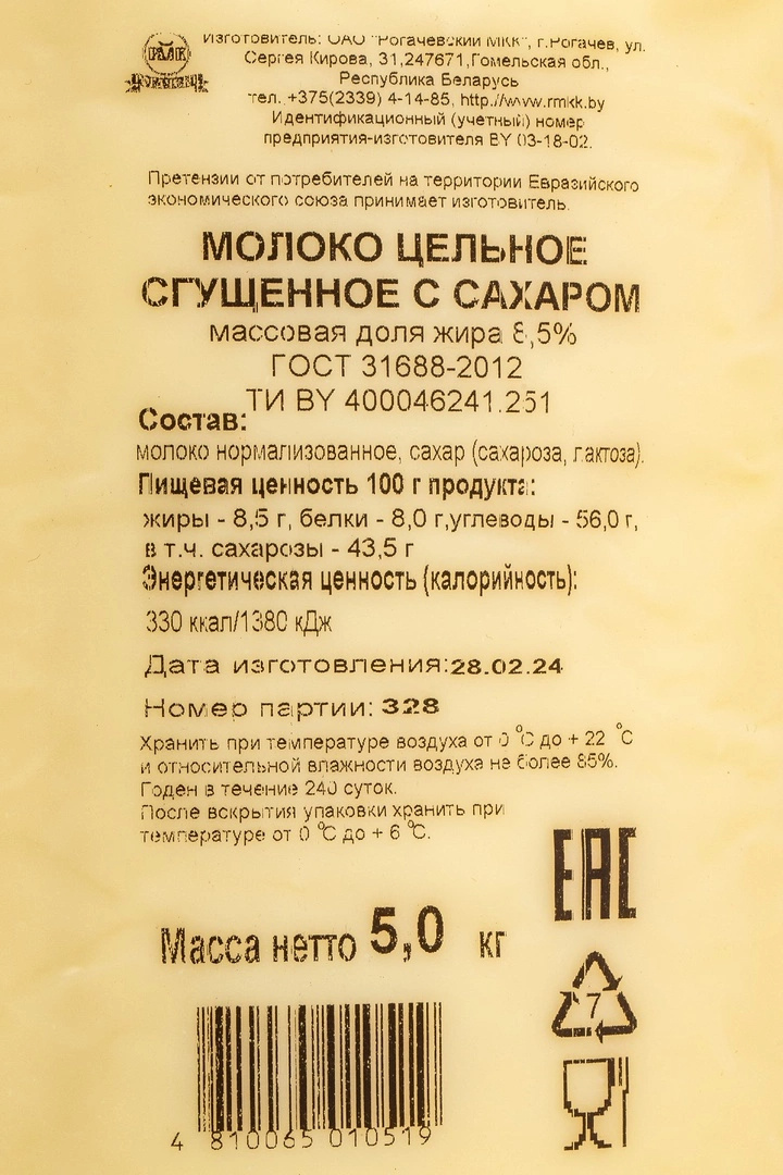 Молоко Сгущенное Рогачевъ Цельное ГОСТ 8,5% 5кг