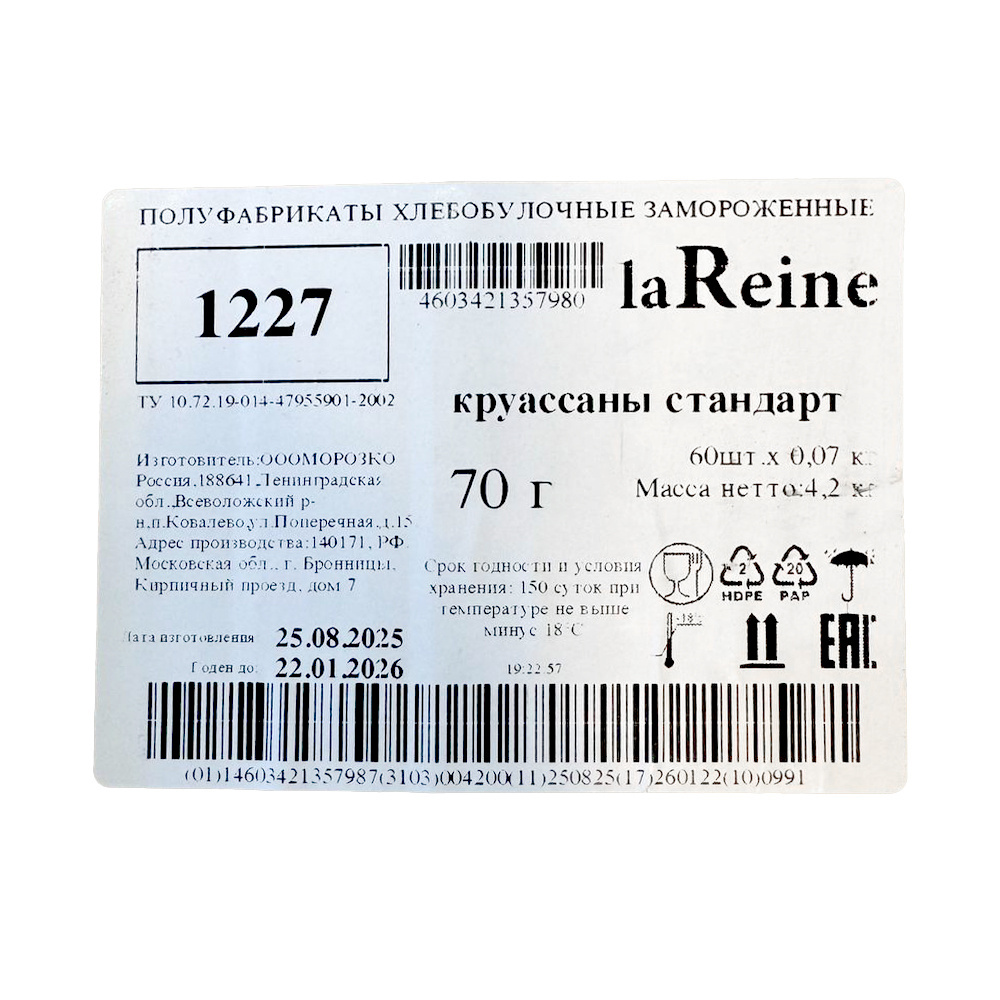 Идеальны для завтрака или перекуса — мини-круассаны La Reine Морозко. Их удобно брать с собой в дорогу, на работу или учёбу. Мини-круассаны отлично подойдут для чаепития и станут прекрасным дополнением к кофе или горячему шоколаду. Вес — 35 грамм.