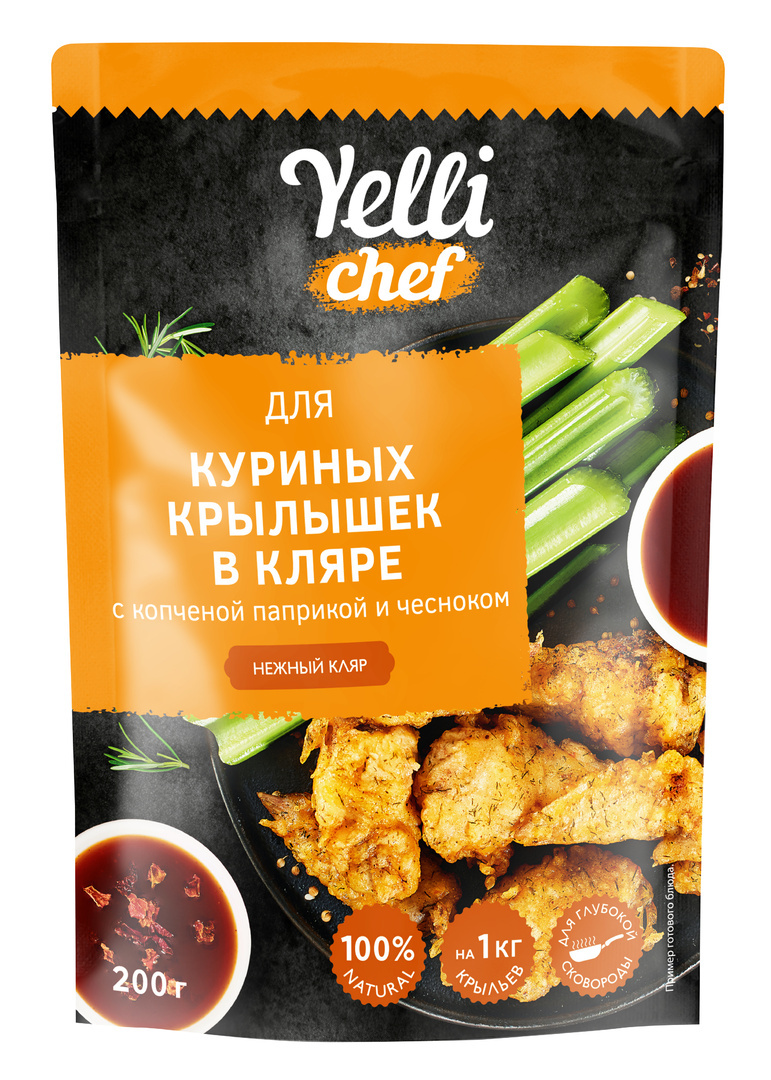 Кляр для куриных крылышек YELLI CHEF – пикантный продукт с натуральными специями, созданный для любителей кулинарного творчества. Используя этого продукт, можно легко приготовить вкуснейшую нежную курочку или овощи в кляре по любому рецепту. В сухом, защищенном от прямых солнечных лучей месте.