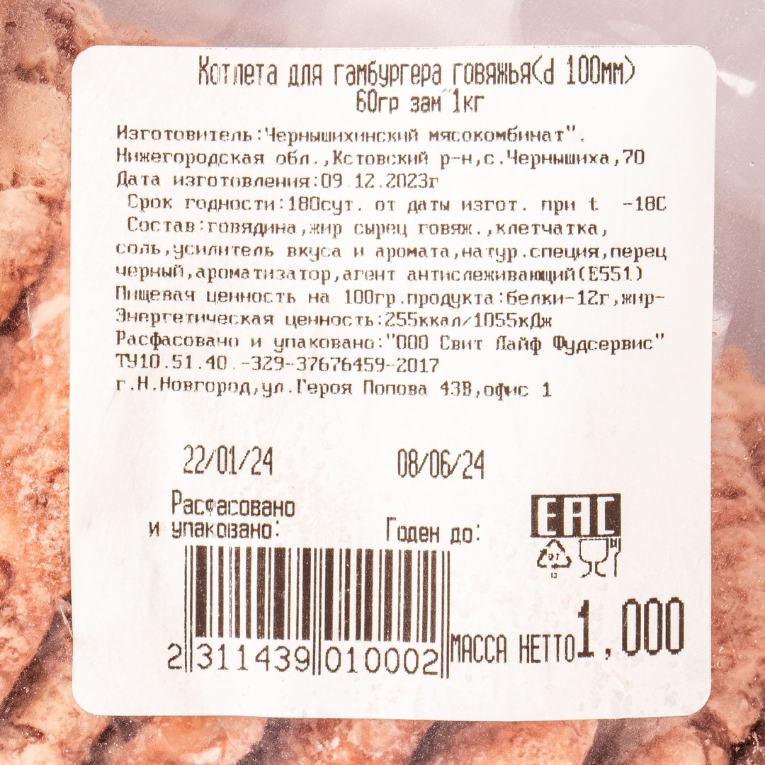 Котлета для Гамбургера Говяжья Зам Чернышихинское Мясо D 100мм 60г 4,5кг