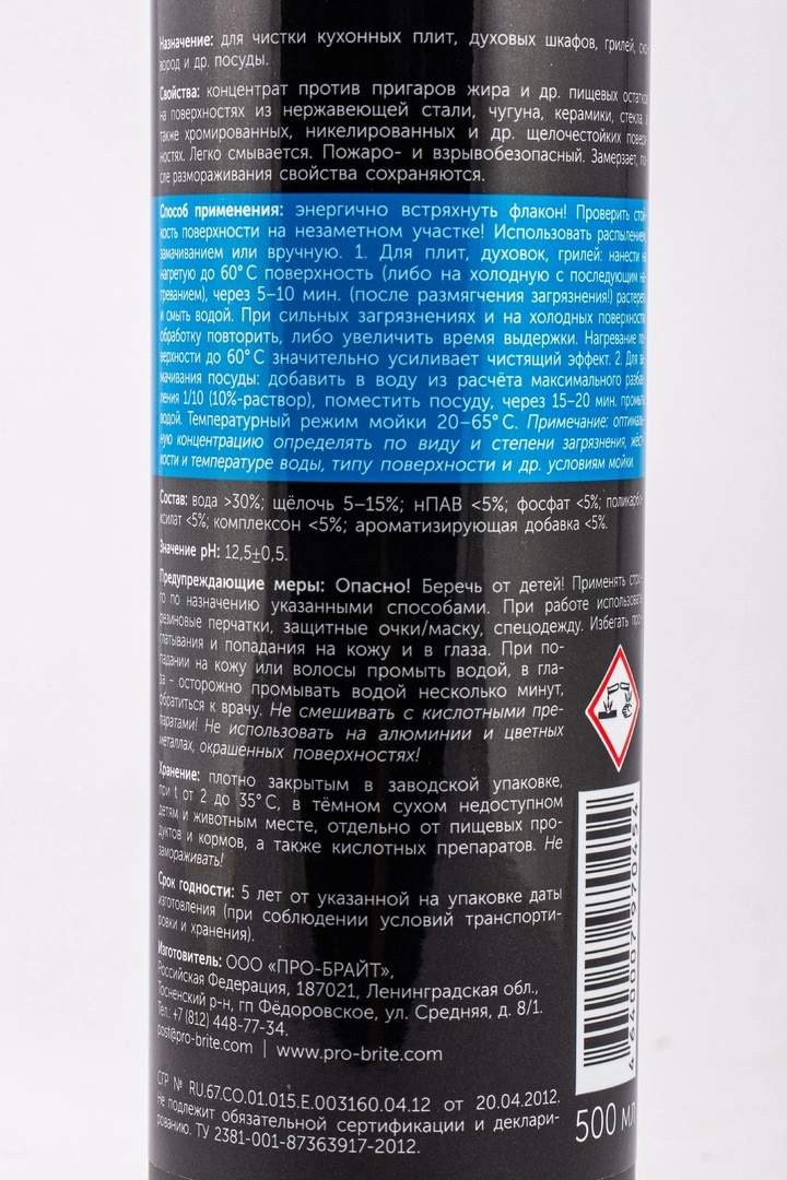 Для эффективной очистки грилей и духовых шкафов от жира и нагара подойдёт специальное средство объёмом 0,5л. Оно упрощает процесс уборки, обеспечивая блеск и чистоту поверхностей. Идеально подходит для поддержания гигиены и внешнего вида кухонной техники.