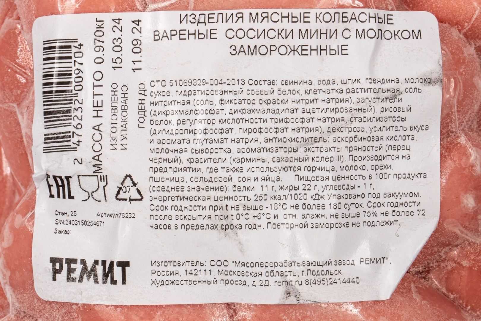 Аппетитные сосиски Мини с молоком приготовлены из свинины и говядины с добавлением молока и пряностей. Их отличает нежный, деликатный вкус с молочными нотками и нежная консистенция. Можно отварить и подать к шведскому столу. Гостям останется определиться с гарниром, можно предложить пасту, овощи. Для удобства ваших гостей сосиски выпускаются без оболочки. Упаковка вакуум.