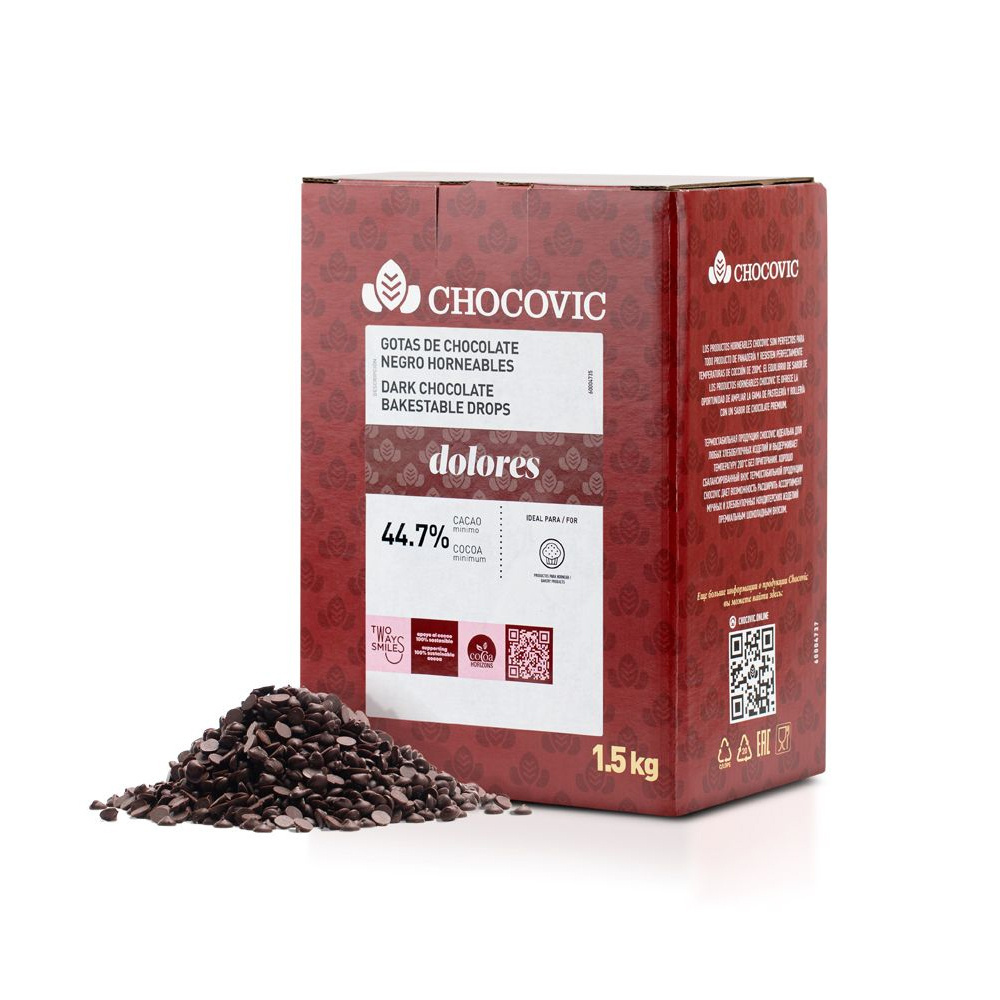 Термостабильные капли из темного шоколада Chocovic Dolores с содержанием какао 44,7% Отлично подходят для добавления в выпечку при замешивании в тесто и для декорирования. Удобная упаковка весом 1,5 кг отлично подойдет для домашнего кондитера.