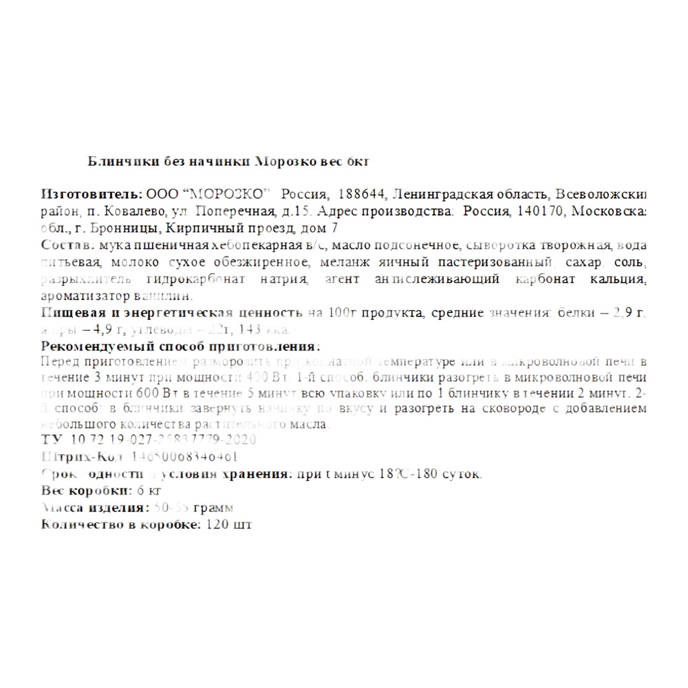 Блинчики Морозко без Начинки Замороженные 120*50г 6кг