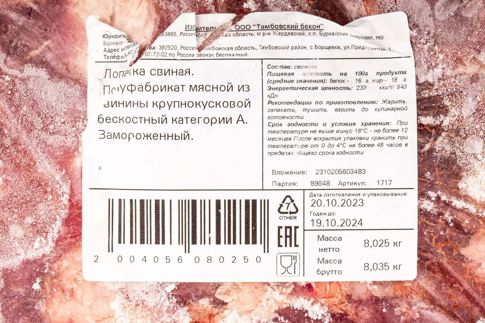 Лопатка Свиная Тамбовский Бекон без Кости Зам 5,5кг в/у