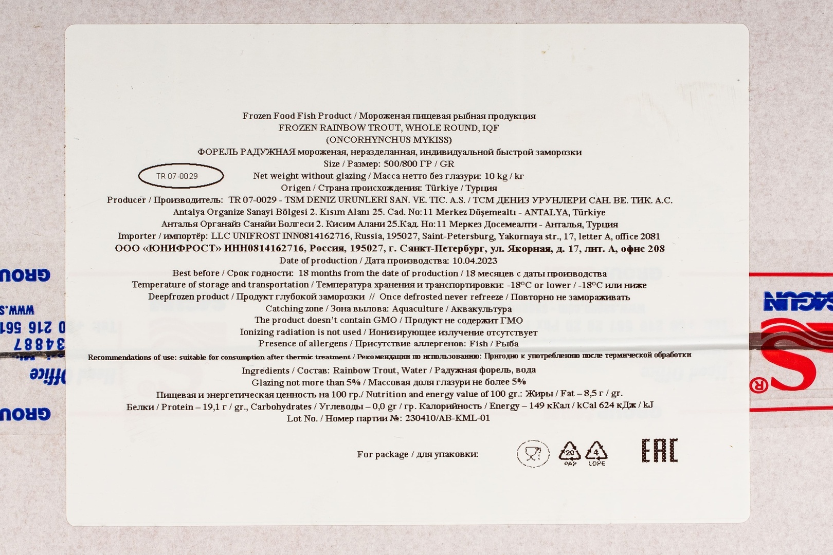Форель радужная зам б/г Турция ~ 0,9-1,4 кг ~ 20 кг ПР-ВО