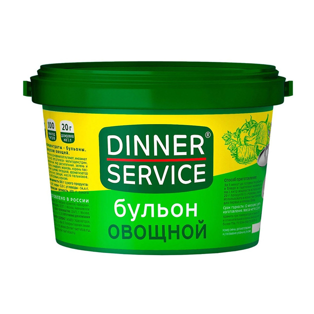 Бульон овощной " DINNER SERVICE" используют как основу для овощных супов, приправа к вторым блюдам с содержанием овощей, добавка к голубцам, салатам и пирогам с овощными напитками.