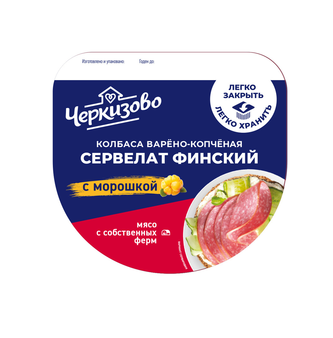 Сервелат уже нарезан тонкими ломтиками , легко сделать бутерброд и очень удобно взять упаковку с собой для перекуса! Морошка в составе наилучшим образом оттеняет натуральный мясной вкус и придает колбасе нотки изысканности. Используются натуральные специи