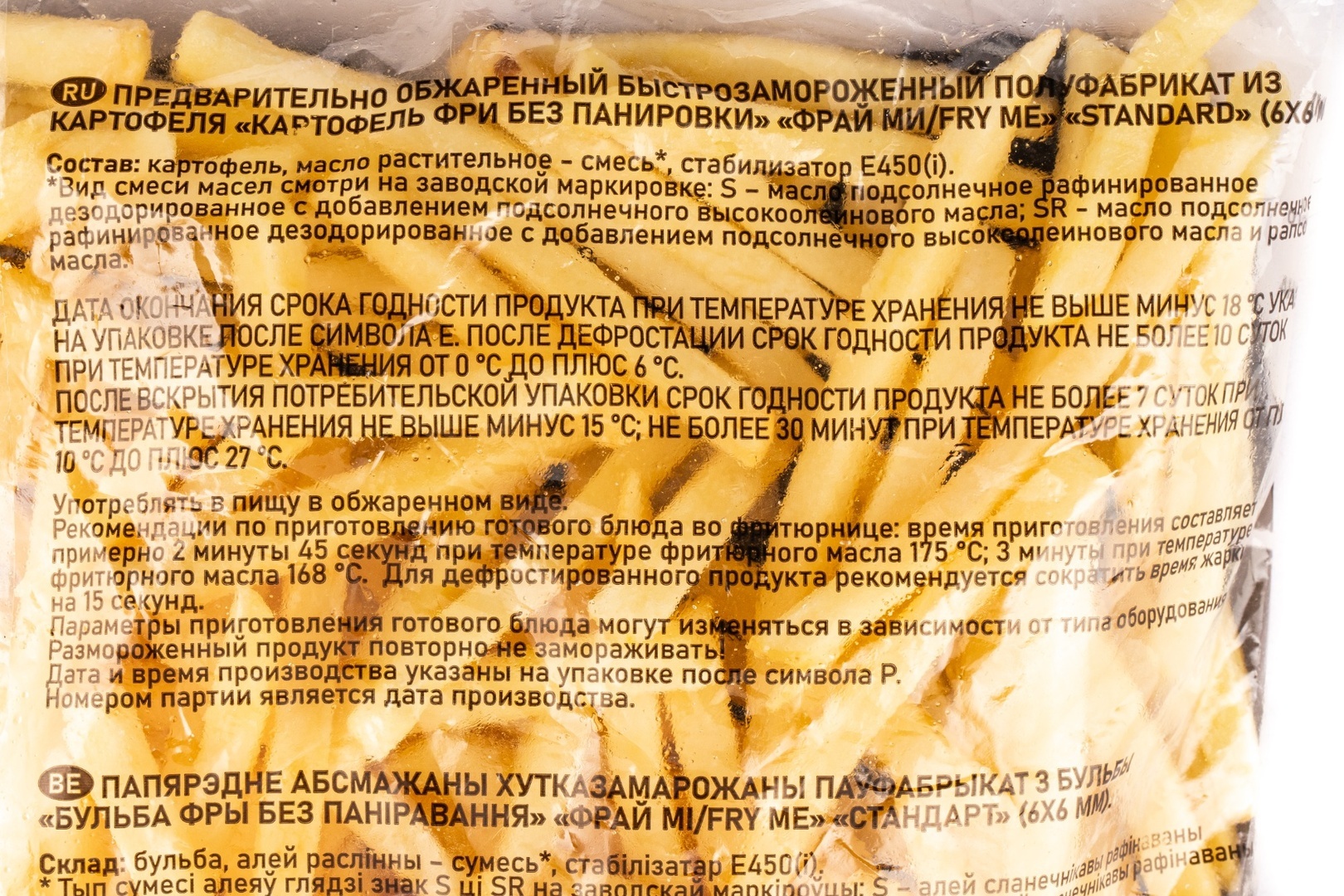 Картофель фри Fry Me Standard — идеальный выбор для быстрого и вкусного перекуса или дополнения к основному блюду. Подходит для жарки во фритюре или на сковороде. Картофель нарезан ровными брусочками толщиной 6мм, что обеспечивает равномерное прожаривание и аппетитную золотистую корочку. Отлично сочетается с соусами и может стать основой для различных закусок.
