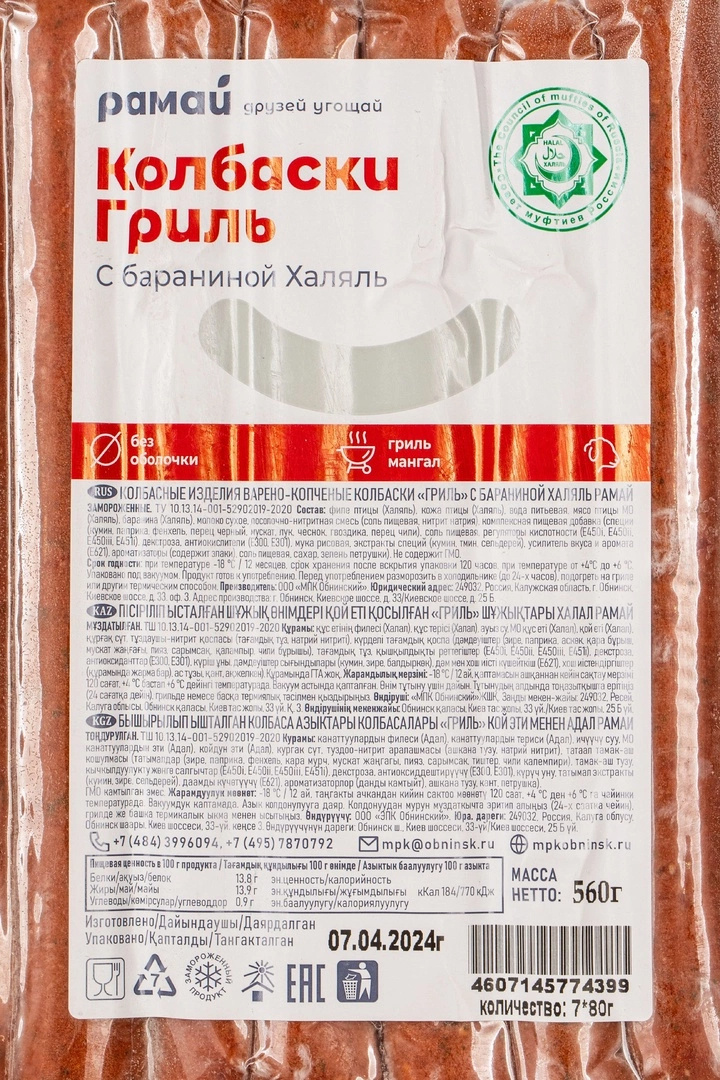 Колбаски Гриль Рамай с Бараниной Халяль Зам 24см 7*80г в/у