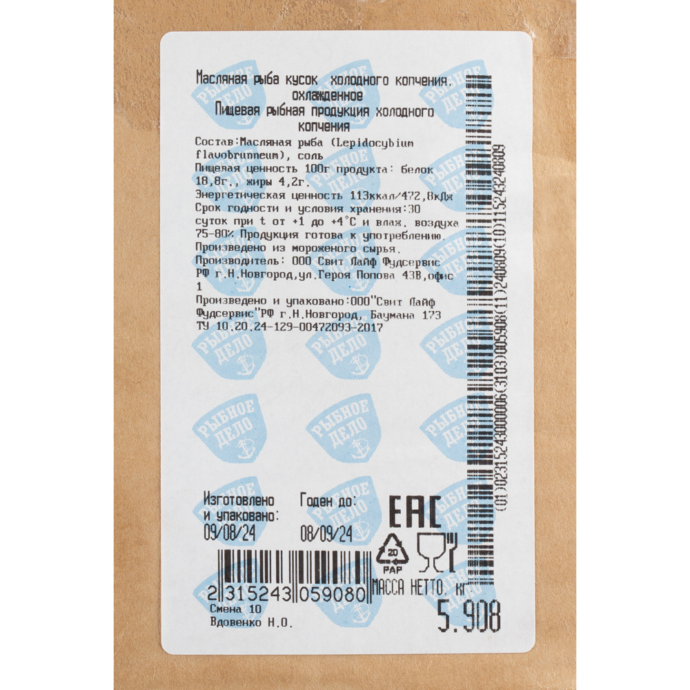 Тушка масляной холодного копчения весом 1,5 кг — идеальный выбор для ценителей белой рыбы. Обладает насыщенным вкусом и ароматом. Подходит для приготовления закусок, салатов и горячих блюд. Отлично дополнит пасту, пиццу или ризотто. Порадует вас и ваших гостей своим вкусом.