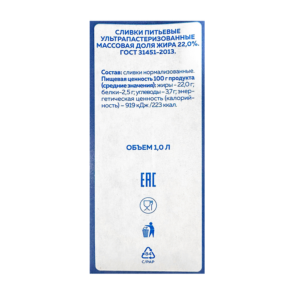 Сливки Smart Chef Ультрапастеризованные ГОСТ 22% 1л