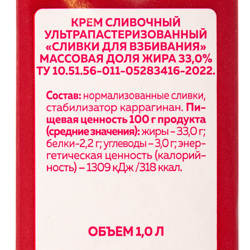 Сливки для взбивания 1л с массовой долей жира 33% производятся на молочных жирах и используют взбитыми и не взбитыми в качестве десерта или в кулинарии. Отличаются высокой скоростью взбивания, устойчивой текстурой после взбивания и приятным натуральным вкусом.