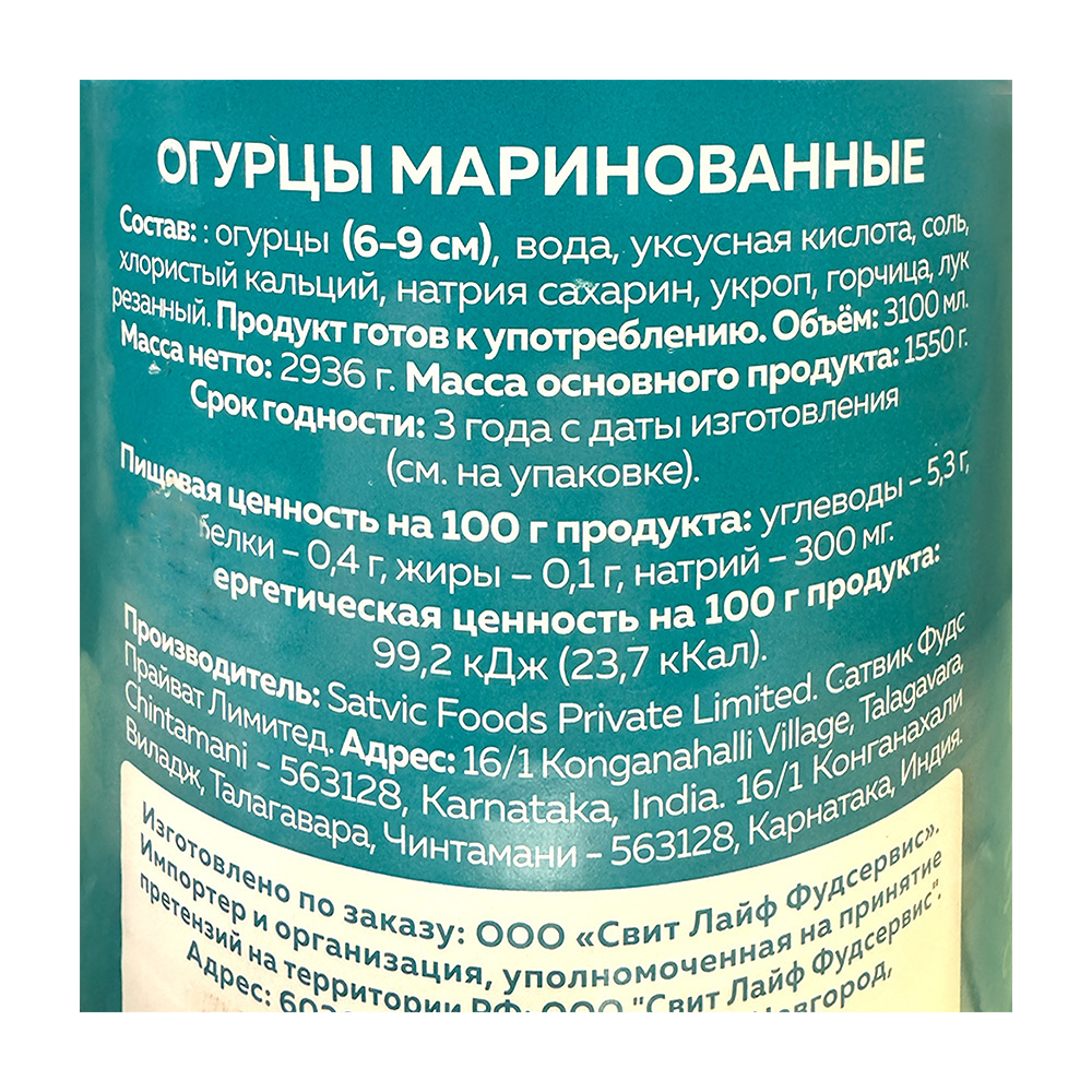 Огурцы Маринованные Smart Chef 6-9см Индия 3,1л Сухой Вес 1,55кг ж/б