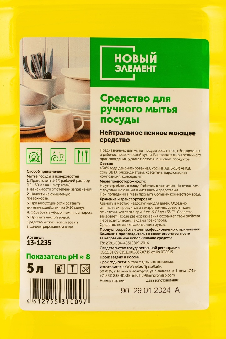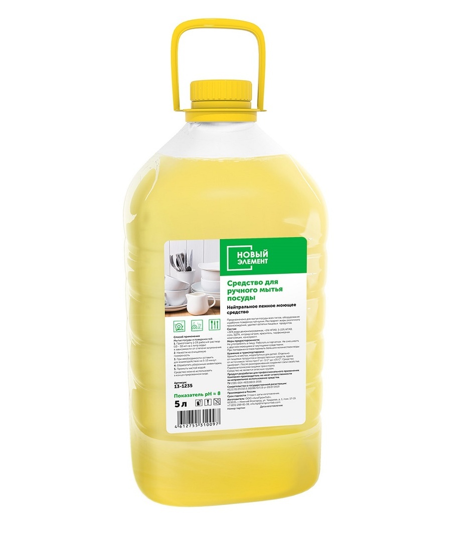 Новый элемент 5 л - это универсальное средство для мытья посуды, которое обеспечивает максимально эффективное и быстрое удаление жира, остатков пищи и других загрязнений с различных поверхностей. Это надежное средство подходит как для использования в бытовых условиях, так и на профессиональных кухнях, где требуется быстрая и качественная обработка посуды.