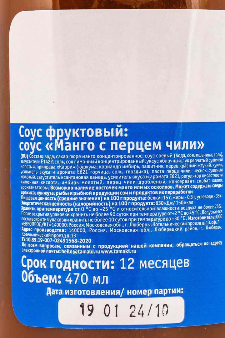 Соус Манго с перцем чили Tamaki 470мл для курицы, к креветкам, рыбе, рису и рисовой лапше, макаронам, пицце, к соевым росткам. Вкус кисло-сладкий, слегка острый, с ароматом натурального манго, чеснока и специй. Отлично сочетается с любыми видами мяса, а так же в смеси с майонезом.