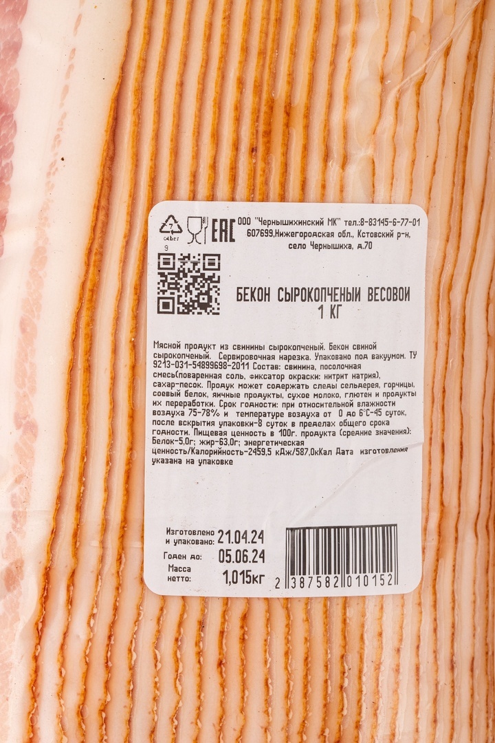 Бекон Свиной Сырокопченый Чернышихинские Колбасы 1кг