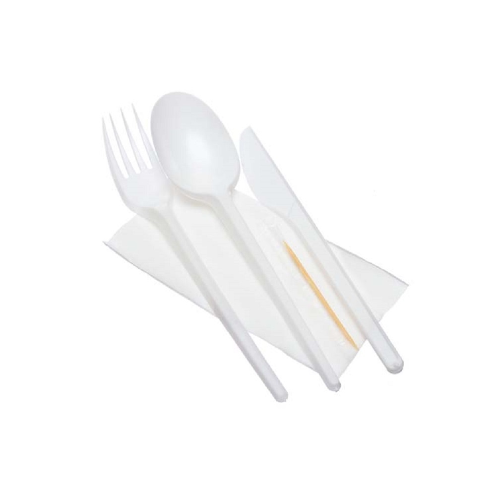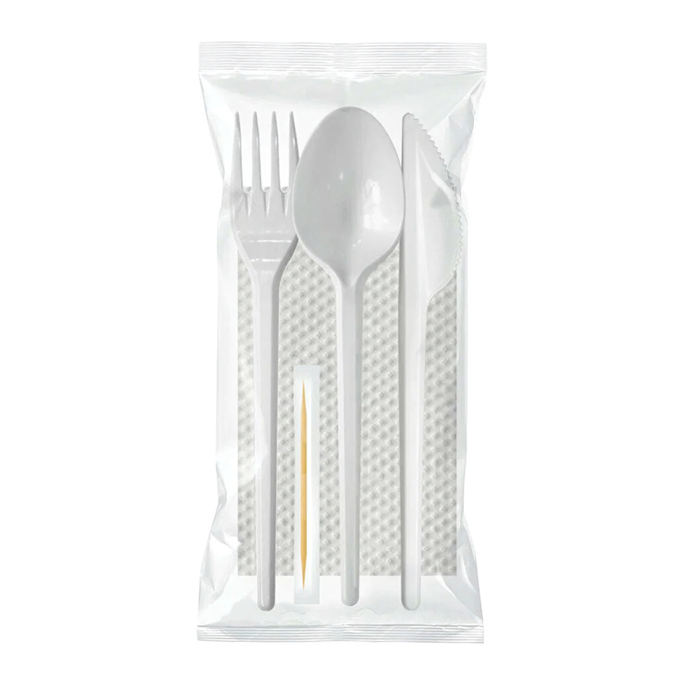 Набор одноразовых приборов: вилка, ложка, нож, зубочистка, салфетка белая. Используется в стрит-фуде, офисах, кафе быстрого обслуживания, на фуд-кортах. Оптимален для комплектации блюд навынос.