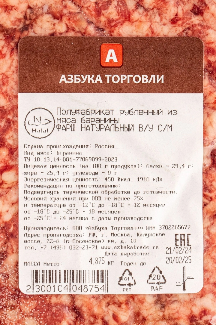 Фарш из Мяса Баранины Азбука Торговли Замороженный Халяль 5кг