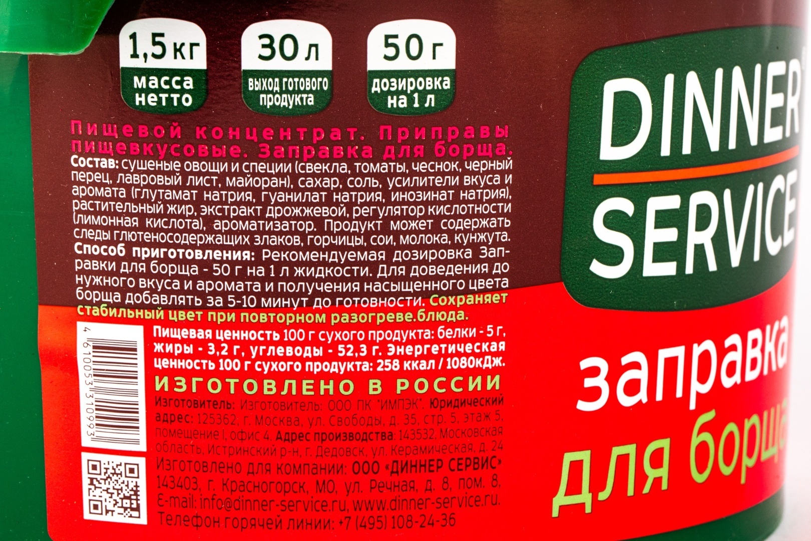 Заправка Dinner Service для борща — идеальное решение для быстрого приготовления насыщенного и вкусного блюда. Подходит для тех, кто ценит свое время и хочет насладиться вкусом традиционного супа. Добавляйте заправку при варке борща, чтобы усилить вкус и аромат.