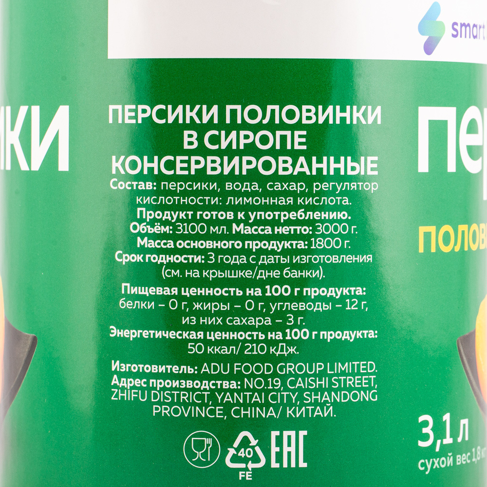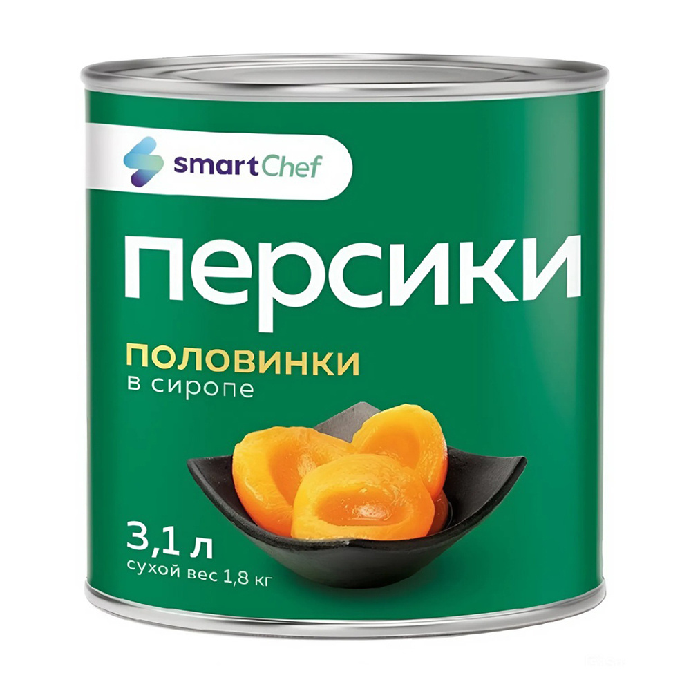 Персики Smart Chef Половинки в Сиропе 3,1л Сухой Вес 1,8кг