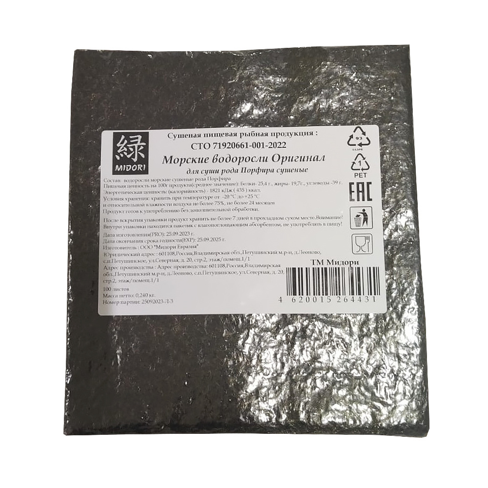 Высококачественные водоросли Нори, идеально приспособлены для скатывания роллов, не рвутся и не трескаются при сворачивании. Морская капуста содержит витамины А,С и важные микроэлементы йод , железо , кальций.