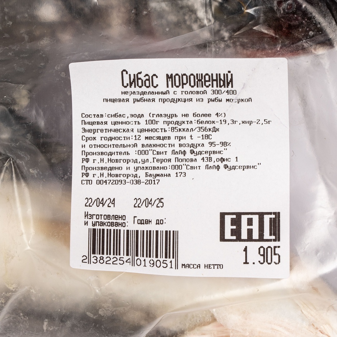 Сибас с Головой Непотрошеный Свежемороженый 300-400г Турция 5кг