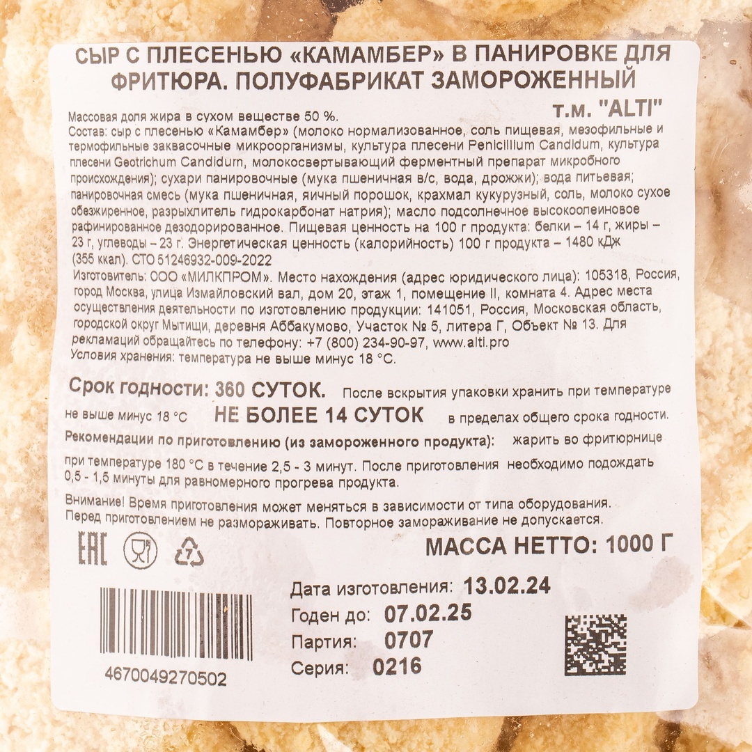 Сыр Alti Камамбер в Панировке для Фритюра 50% 1кг