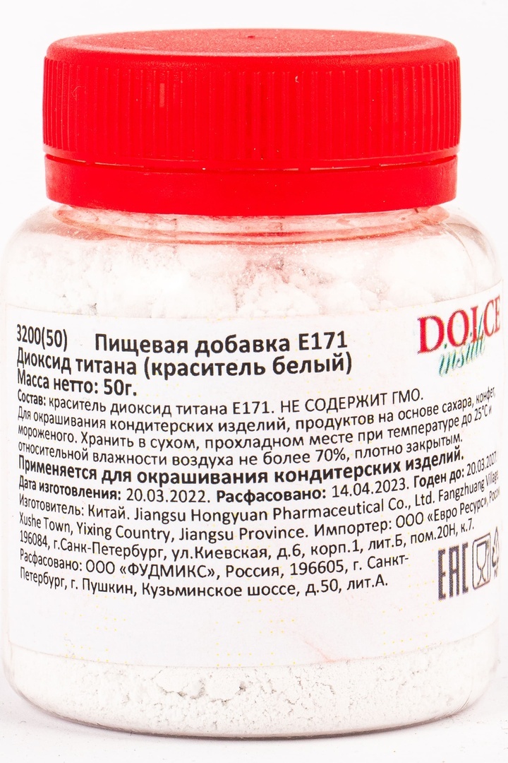 Белый пищевой краситель Диоксид титана Е171 не является ядовитым или канцерогенным веществом, как это считалось ранее. Он – химической ингредиент, созданный из титаносодержащих руд. Выглядит как порошок белого цвета, без вкуса и запаха. Используется для придания белоснежного оттенка сгущенному и сухому молоку, йогуртам, сметане, муке, жевательным резинкам, кондитерскому крему, глазури, начинкам и т.п.