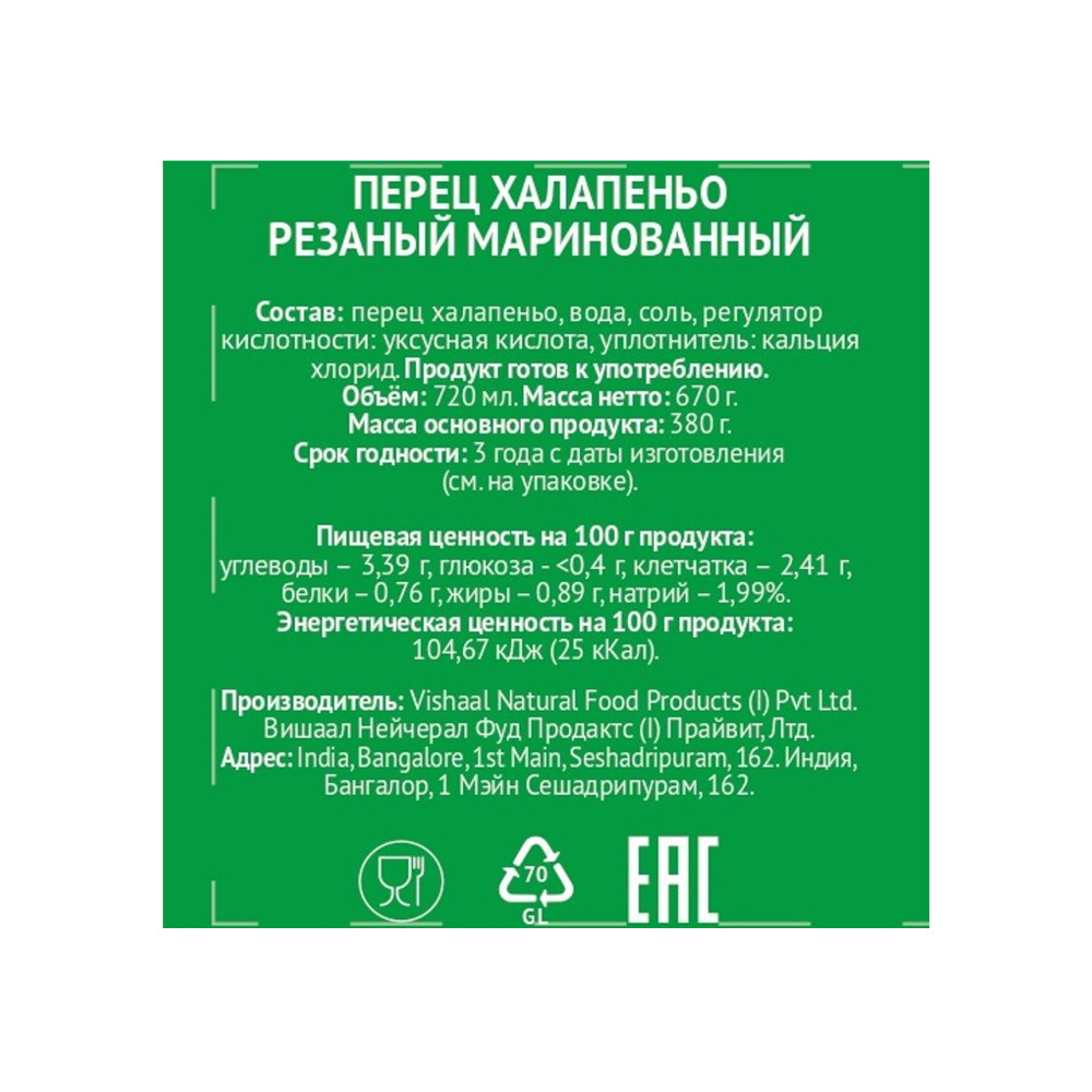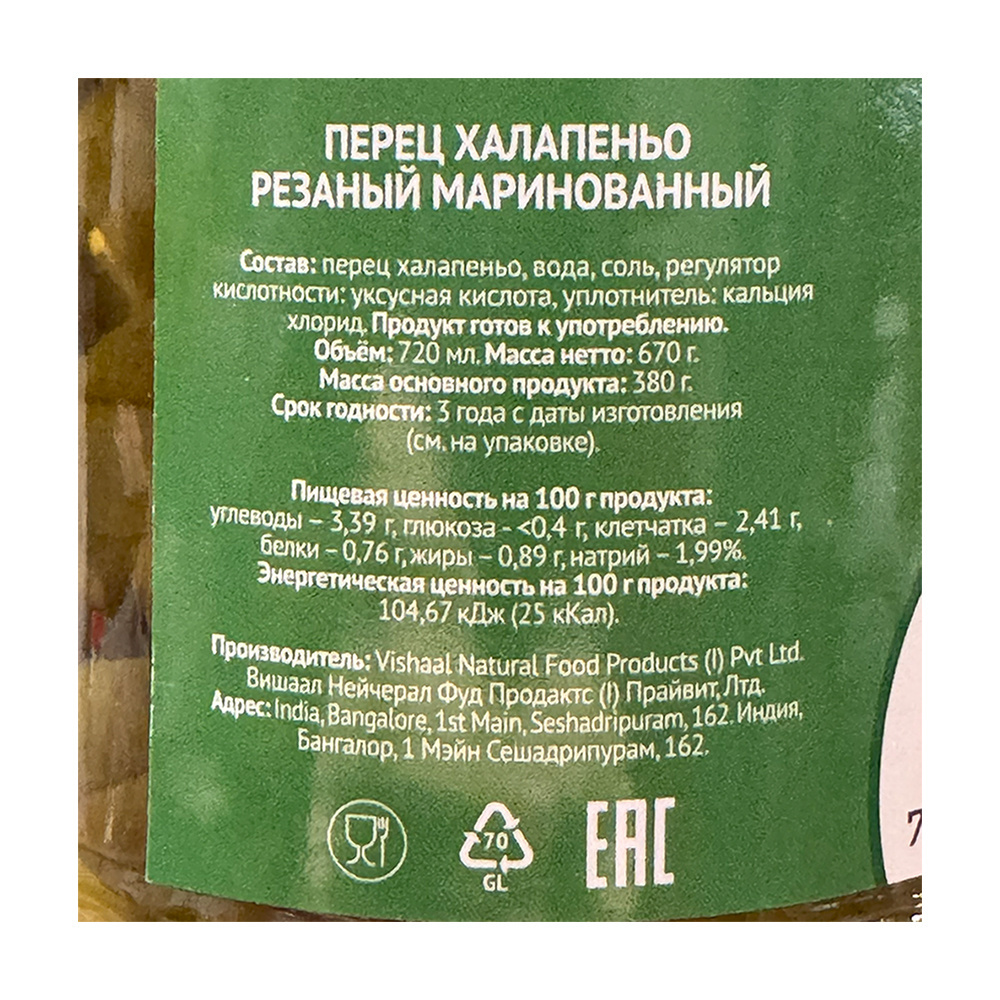 Перец Халапеньо Smart Chef Резаный Индия 720мл Сух. Вес 380г