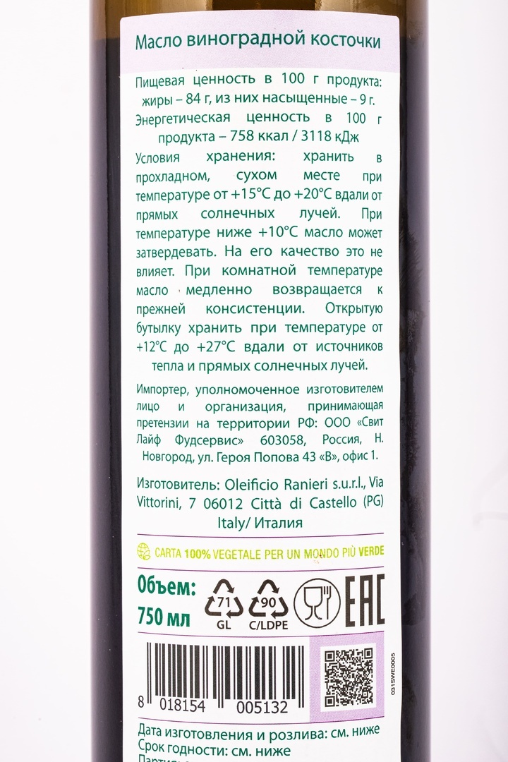 Идеально подходит для приготовления разнообразных блюд — от салатов до горячих закусок. Благодаря лёгкому вкусу и аромату масло виноградной косточки от Ranieri станет прекрасным дополнением к вашим кулинарным шедеврам. Объём 750мл подойдёт для частого использования.