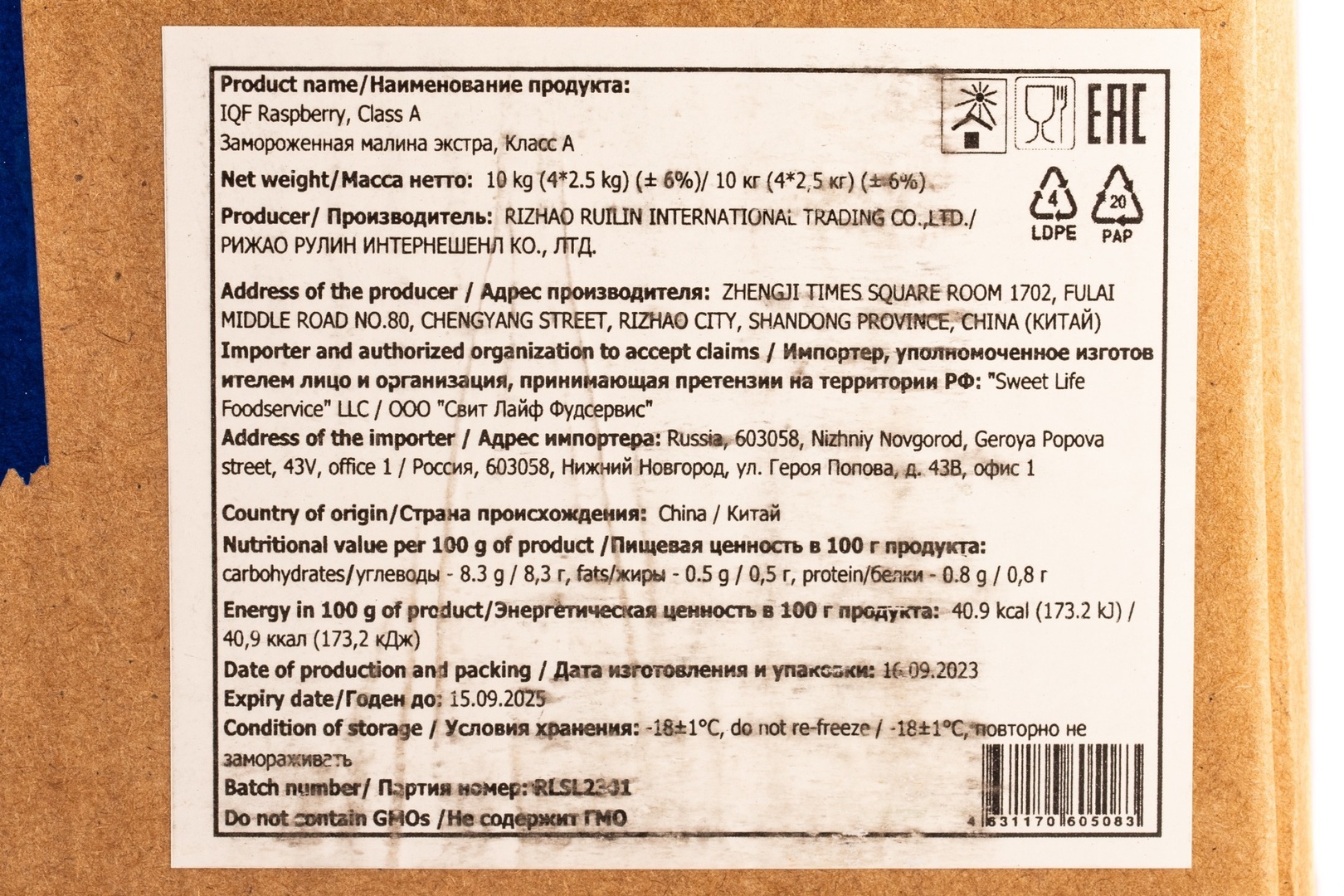 Малина Экстра Класс А Свежемороженая Китай 4*2,5кг 10кг
