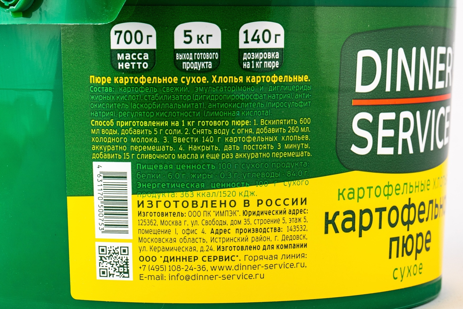 Картофельное пюре - один из самых популярных гарниров. Мы используем только самый качественный картофель одинаковых сортов , поэтому DINNER SERVICE гарантирует вам высокое качество натурального картофельного пюре круглый год. Картофельного пюре "DINNER SERVICE" готовится всего за 10 минут: кипятим 0,610 литров воды, добавить 5 г соли,снимаем с плиты, добавляем 270 мл молока и 130 грамм нашего пюре. Аккуратно перемешиваем. Как использовать: в качестве гарнира, как начинку для пирожков с картошкой, как панировку, основу для супа-пюре.