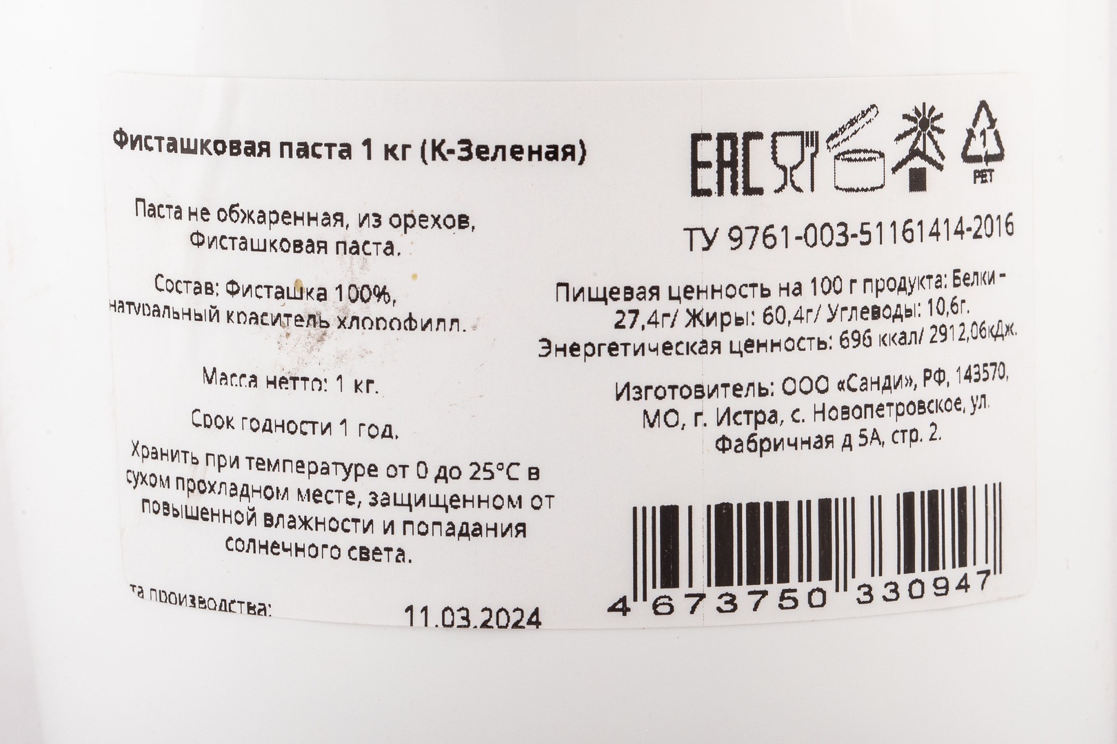 Паста ядер орехов фисташки обжаренных для придания кондитерским изделиям, десертам и мороженому вкуса и цвета фисташек. Органолептические характеристики: Густая кремообразная паста темно-зеленого цвета со вкусом и ароматом фисташковых орехов.