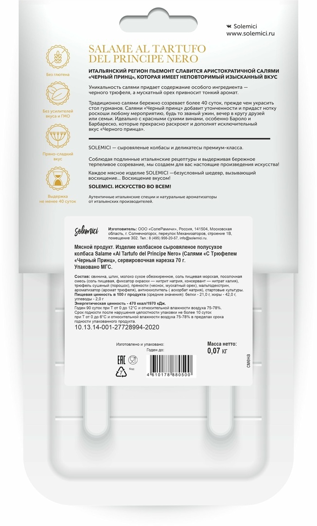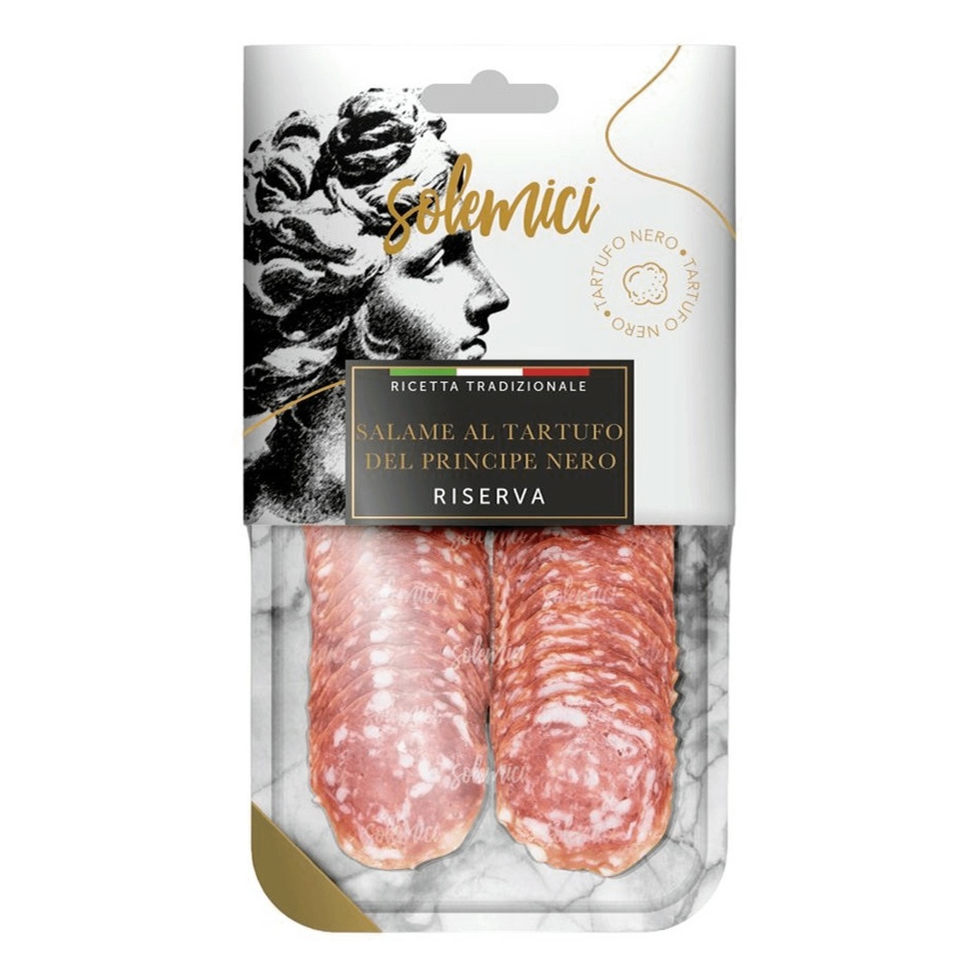Уникальность салями придает содержание особого ингредиента- черного трюфеля, а мускатный орех привносит тонкий аромат. Идеально с красными сухими винами, особенно с Бароло и Барбареско, которые прекрасно раскроют и дополнят исключительный вкус.