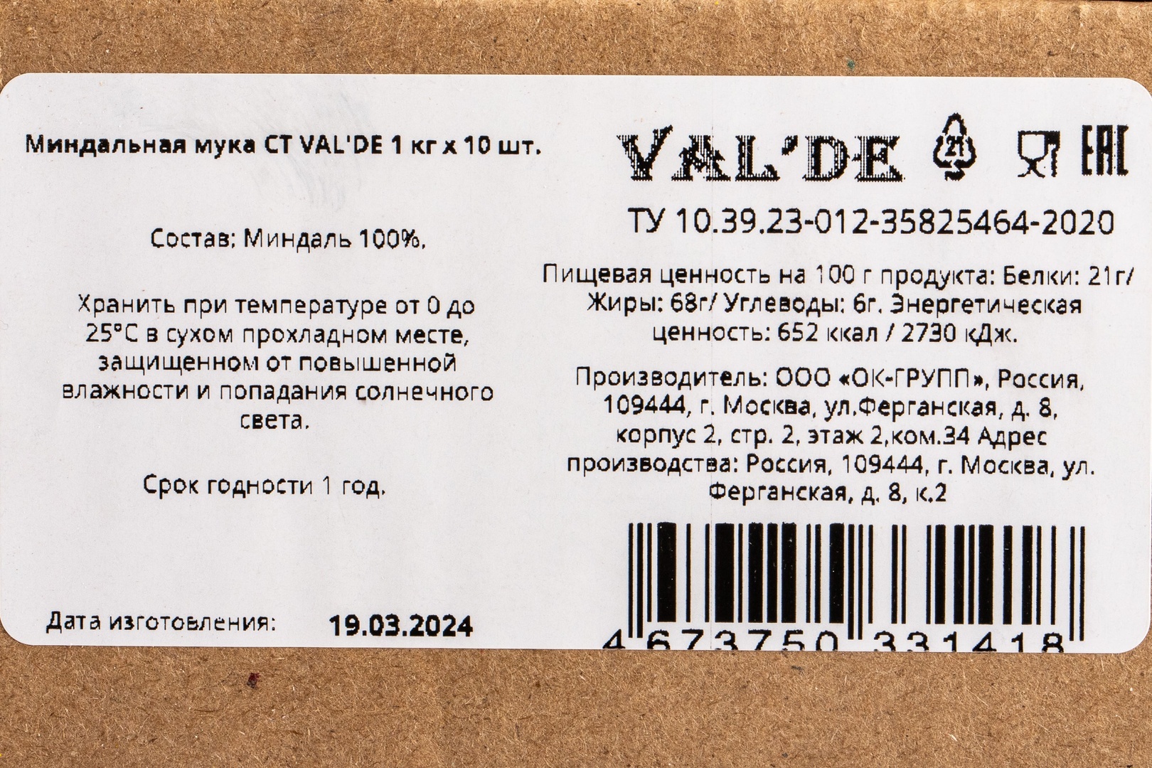Миндальная мука, изготовлена из 100 % ядра бланшированного миндаля, дробленые, подсушенные Для изготовления используются крупные ядра орехов, которые в процессе производства измельчаются в пудру, размер помола 0,8-1,00 мм. При изготовлении муки используются технологии, которые помогают сохранить все полезные свойства ореха. Применяется в первую очередь для приготовления различных десертов.