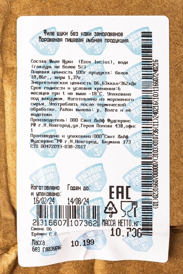 Филе Щуки Рыбное Дело без Кожи Замороженное 10кг