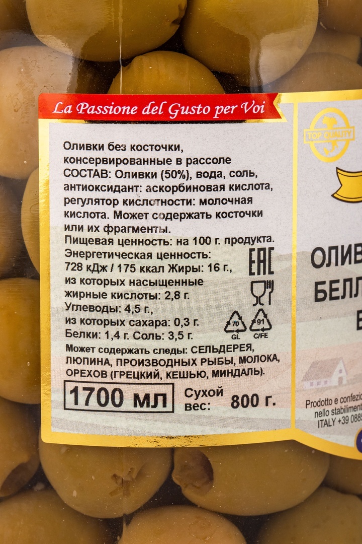 Оливки Белла ди Чериньола без косточки — идеальный выбор для любителей итальянской кухни. Эти гигантские оливки в банке объёмом 1,7л станут отличным дополнением к закускам, салатам и горячим блюдам. Они придадут вашим кулинарным шедеврам насыщенный вкус и аромат.
